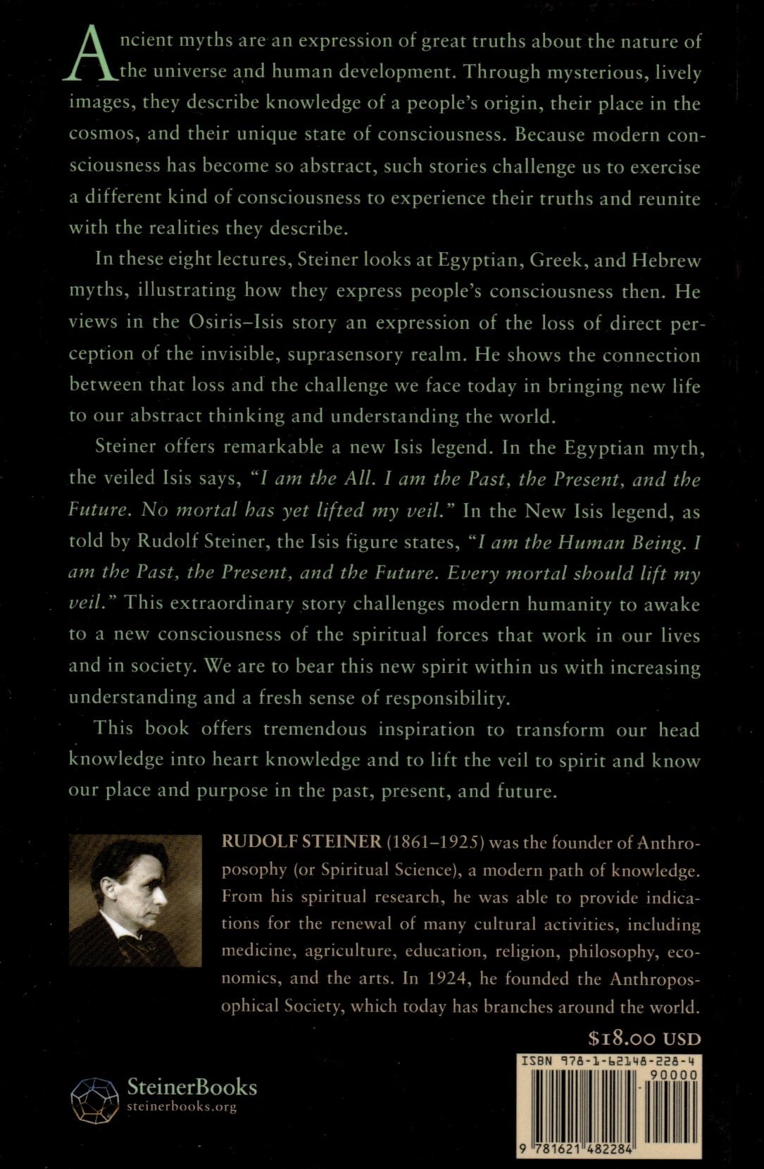 Steiner offers remarkable a new Isis legend. In the Egyptian myth, the veiled Isis says, “I am the All. I am the Past, the Present, and the Future. No mortal has yet lifted my veil.” In the New Isis legend, as told by Rudolf Steiner, the Isis figure states, “I am the Human Being. I am the Past, the Present, and the Future. Every mortal should lift my veil.” This extraordinary story challenges modern humanity to awake to a new consciousness of the spiritual forces that work in our lives and in society. We are to bear this new spirit within us with increasing understanding and a fresh sense of responsibility.