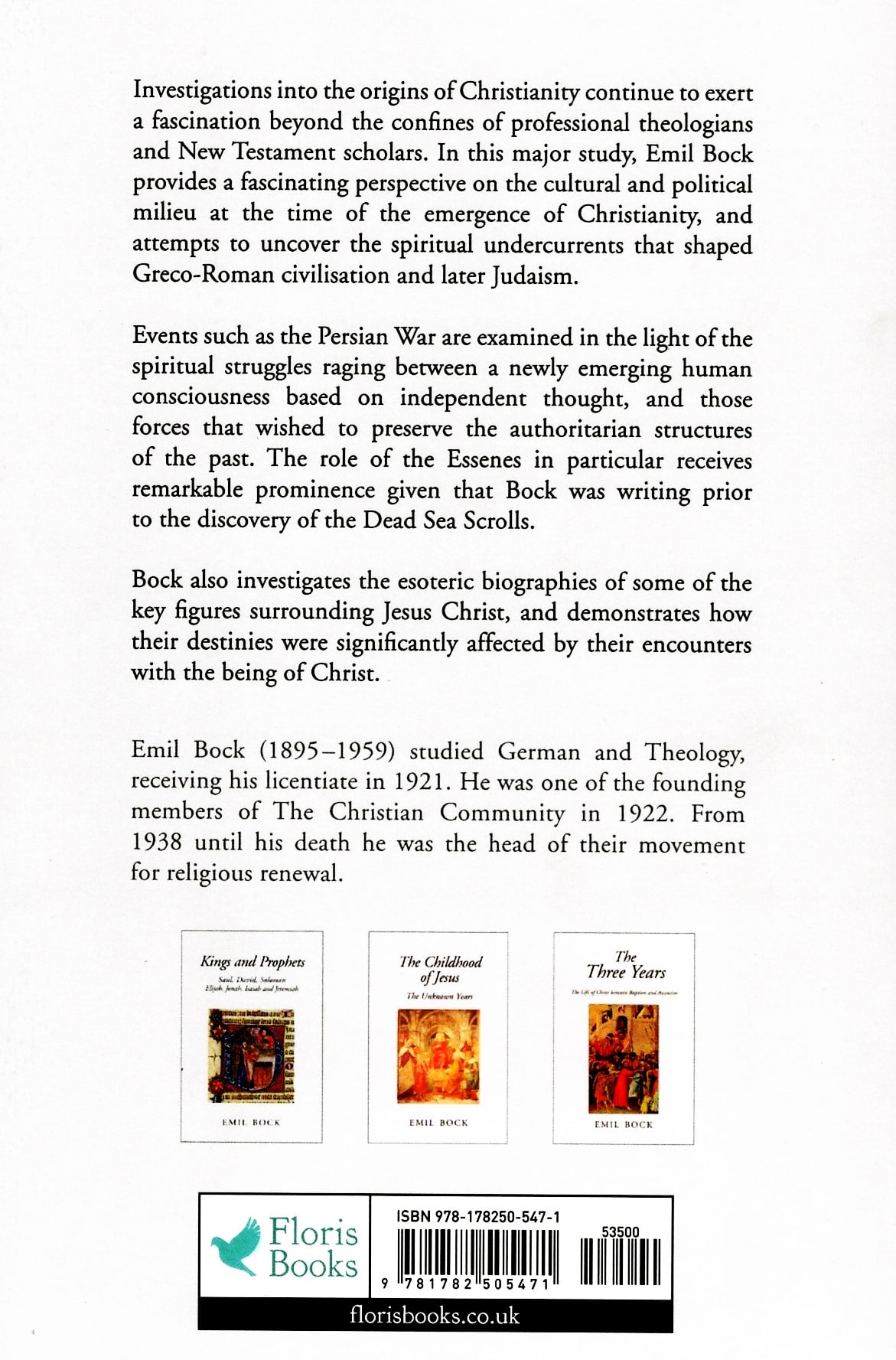 Emil Bock (1895–1959) was born in Wuppertal, Germany, in 1895. He studied German and modern languages at the University of Bonn and, after joining the army, was wounded at the war front in Flanders. In 1916, while still in the army, he met the famous evangelical preacher, Friedrich Rittelmeyer, in Berlin. After his release from the military, he studied Protestant theology in Berlin and later attended priest courses with Rudolf Steiner in Stuttgart and Dornach. With Rittelmeyer, Bock helped establish the Christian Community (the movement for religious renewal) in 1922 and soon became its leader, a position he held until his death. In November, 1922, Bock married Grete Seumer, with whom he had four children. He remained a priest, writer, and lecturer until his death in Stuttgart. Bock’s many books include Genesis; Moses; Kings and Prophets; Caesars and Apostles, The Three Years; Saint Paul; and The Childhood of Jesus.