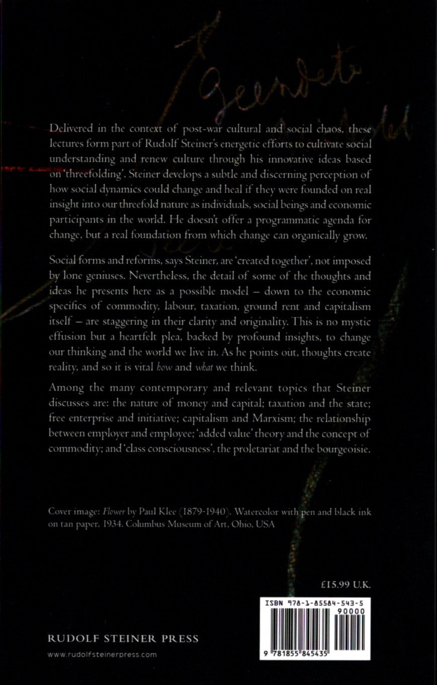 Delivered in the context of postwar cultural and social chaos, these lectures form part of Rudolf Steiner’s energetic efforts to cultivate social understanding and renew culture through his innovative ideas based on “threefolding.” Steiner develops subtle and discerning perception of how social dynamics could change and heal if they were founded on real insight into our threefold nature as individuals, social beings, and economic participants in the world. He doesn’t offer a programmatic agenda for change, but a real foundation from which change can organically grow.