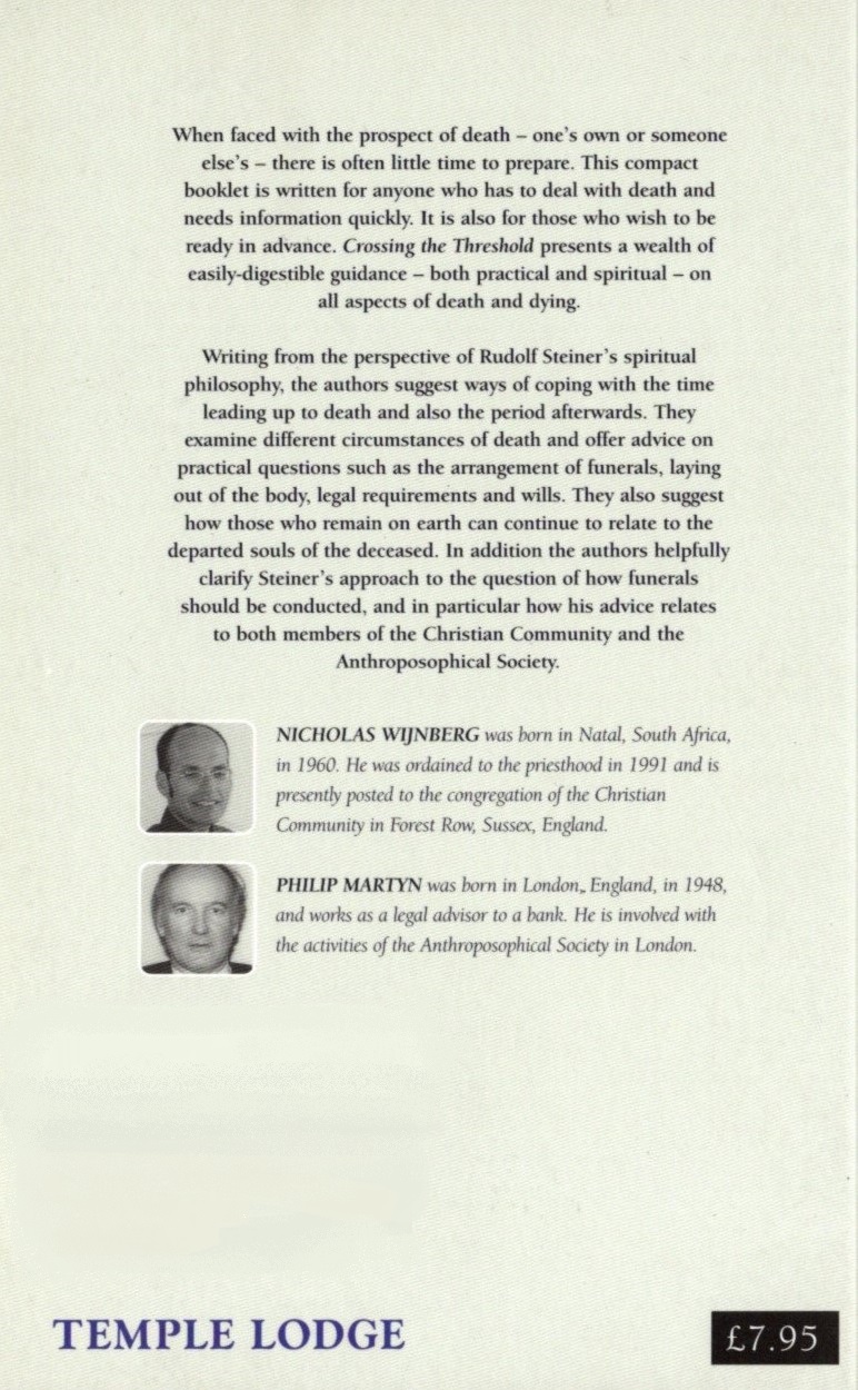 Writing from the perspective of Rudolf Steiner’s spiritual philosophy, the authors suggest ways of coping with the time leading up to death and also the period afterwards. They examine different circumstances of death and offer advice on practical questions such as the arrangement of funerals, laying out of the body, legal requirements and wills. They also suggest how those who remain on earth can continue to relate to the departed souls of the deceased. In addition, the authors helpfully clarify Steiner’s approach to the question of how funerals should be conducted, and in particular how his advice relates to both members of The Christian Community and the Anthroposophical Society.