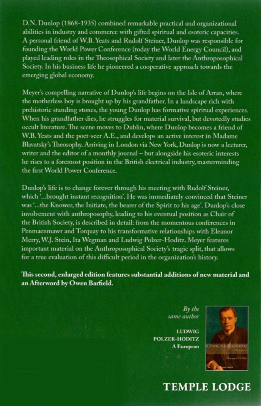 D. N. Dunlop (1868–1935) combined remarkable practical and organizational abilities in industry and commerce along with the gifts of spiritual and esoteric capacities. A personal friend of W. B. Yeats and Rudolf Steiner, Dunlop was responsible for establishing the World Power Conference (today the World Energy Council) and played leading roles in the Theosophical Society and later in the Anthroposophical Society. In his business life, he pioneered a cooperative approach toward the emerging global economy.