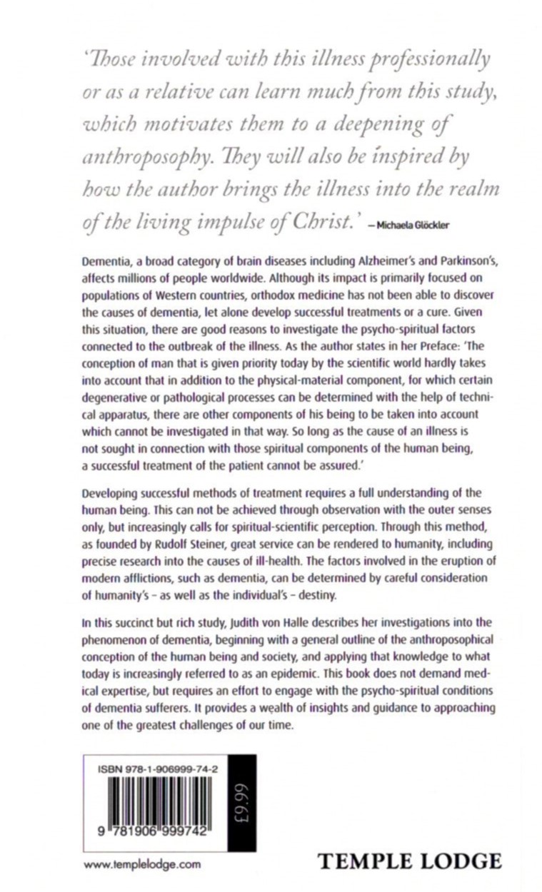 In this succinct but rich study, Judith von Halle describes her investigations into the phenomenon of dementia, beginning with a general outline of the anthroposophic view of the human being and society, and applying that knowledge to what today is increasingly referred to as an epidemic. This book does not require medical expertise, but rather an effort to engage with the psychospiritual conditions of those suffering dementia. It provides a wealth of insights and guidance to approaching one of the greatest challenges of our time.