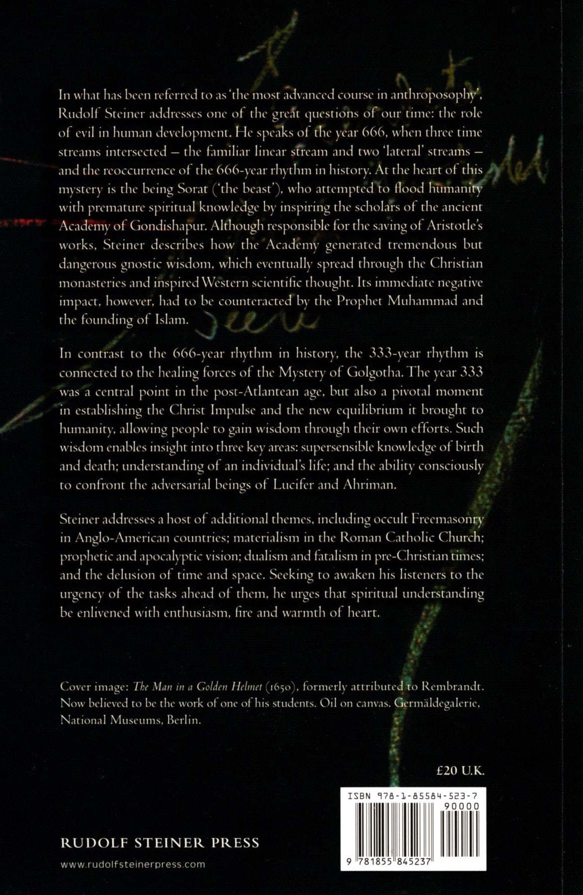 In this “advanced course in Anthroposophy,” Rudolf Steiner addresses a great question of our time: What is the role of evil in human development? He discusses the year 666, when three streams of time intersected—the familiar linear stream and two “lateral” streams—and the reoccurrence of the 666-year rhythm in history.
