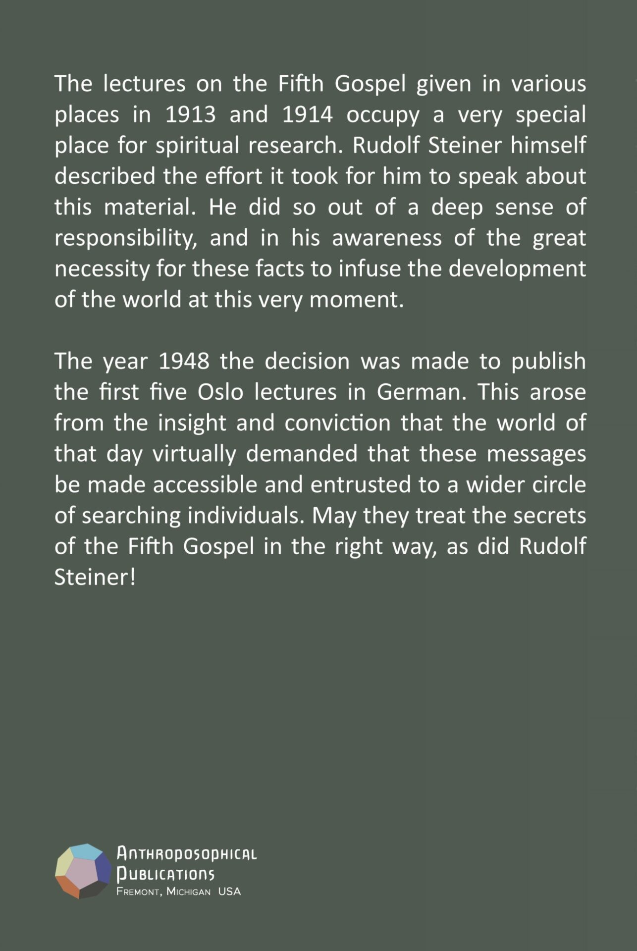 In the year 1948, the decision was made to publish the first five Oslo lectures in German. This arose from an insight and conviction that the world of that day virtually demanded that these messages be made accessible and entrusted to a wider circle of searching individuals. May they treat the secrets of the Fifth Gospel in the right way, as did Rudolf Steiner!