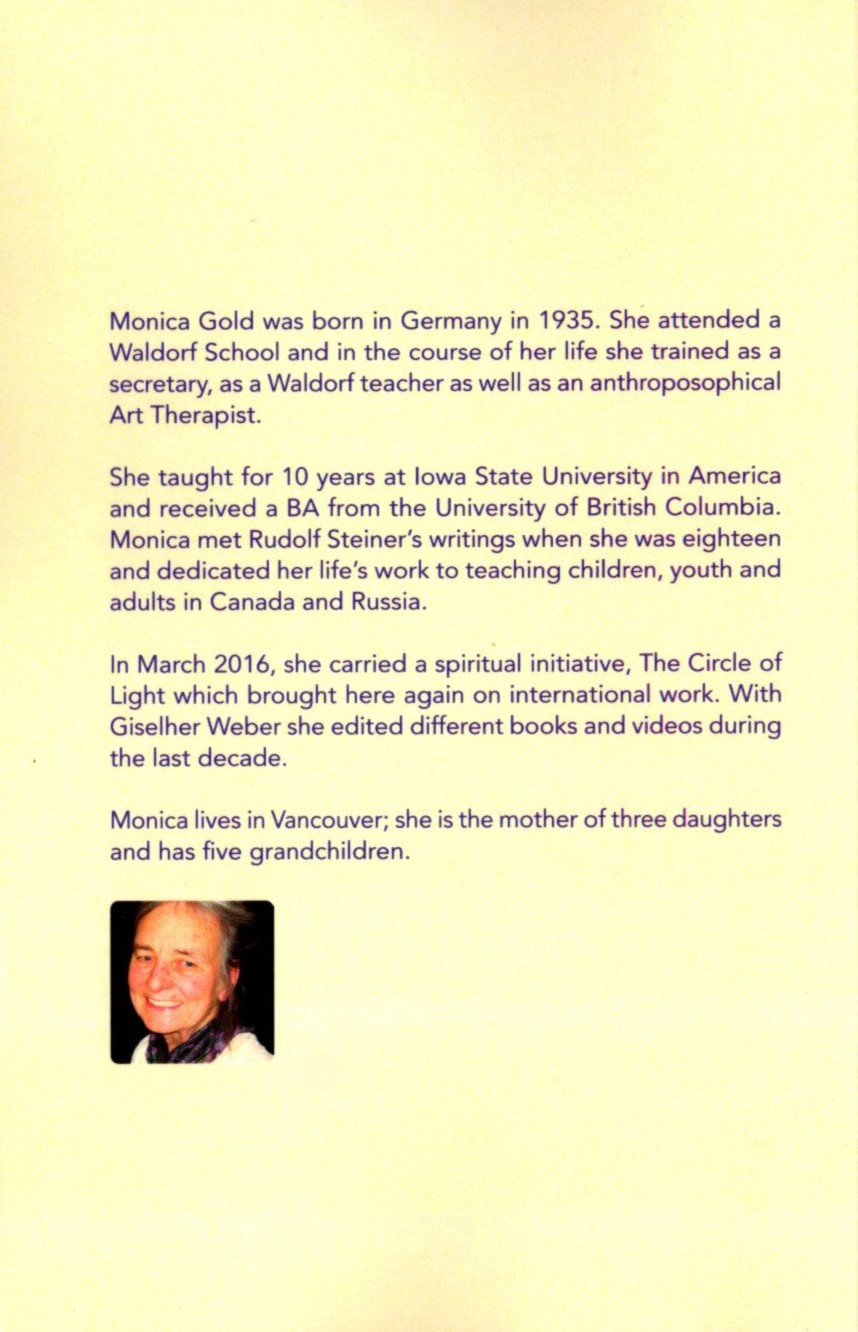 Monica Gold was born in Germany in 1935. She attended a Waldorf school and throughout her life, she trained as a secretary, Waldorf teacher, and anthroposophic art therapist. She taught for 10 years at Iowa State University in the United States and earned a bachelor’s degree from the University of British Columbia. Monica discovered the writings of Rudolf Steiner at the age of eighteen and dedicated her lifelong work to teaching children, youth, and adults in Canada and Russia. In March 2016, she launched a spiritual initiative, The Circle of Light, which brought her back to working internationally. Together with Giselher Weber, she has edited various books and videos over the past decade. Monica lives in Vancouver; she is the mother of three daughters and has five grandchildren.