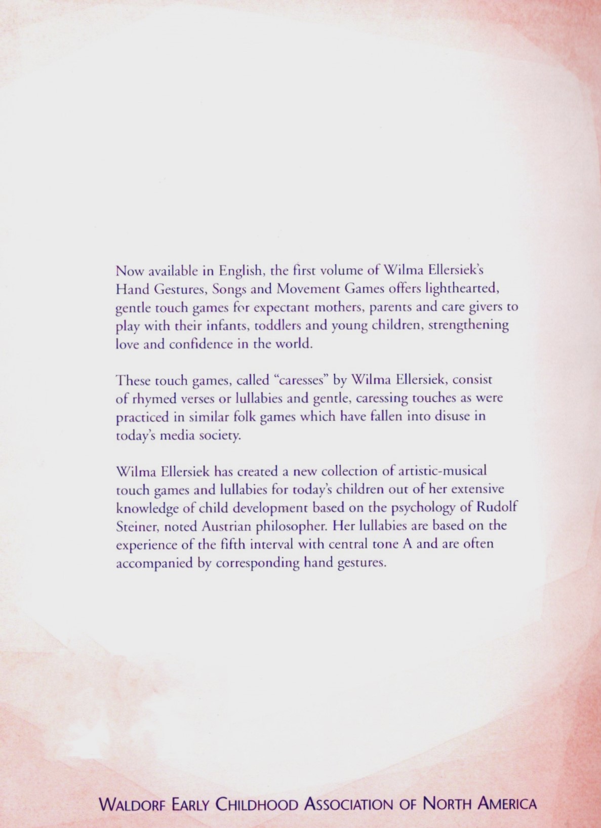An invaluable resource for parents, kindergarten and nursery teachers, home-schoolers, or anyone with an interest in keeping “in touch” with the kingdom of childhood. These games and lullabies are imbued with the idea that loving contact with children helps them “to establish a careful, nurturing relation with plants, animals, people and things in their surroundings,” and movement leads them to a keen awareness of their important place in all of it.