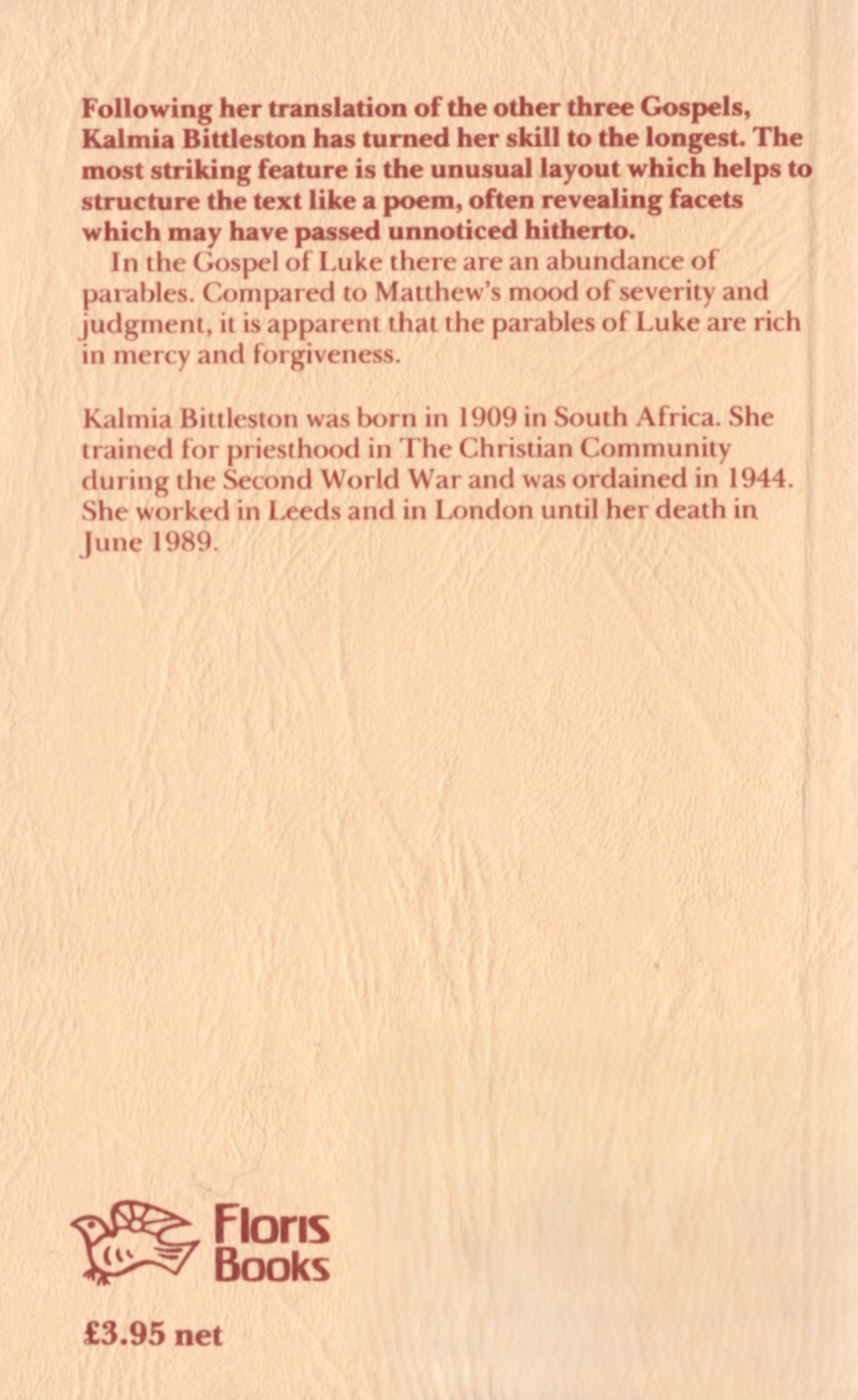 The Gospels of Matthew, Mark, Luke and John have been translated many times into many languages. Kalmia Bittleston, an ordained priest of the Christian Community, spent the last ten years of her life translating the classic texts from the original Greek. But hers is a different kind of translation: at once lyrical and down-to-earth, she adopted a unique verse style which she felt would best convey the meaning and structure of the Gospels.