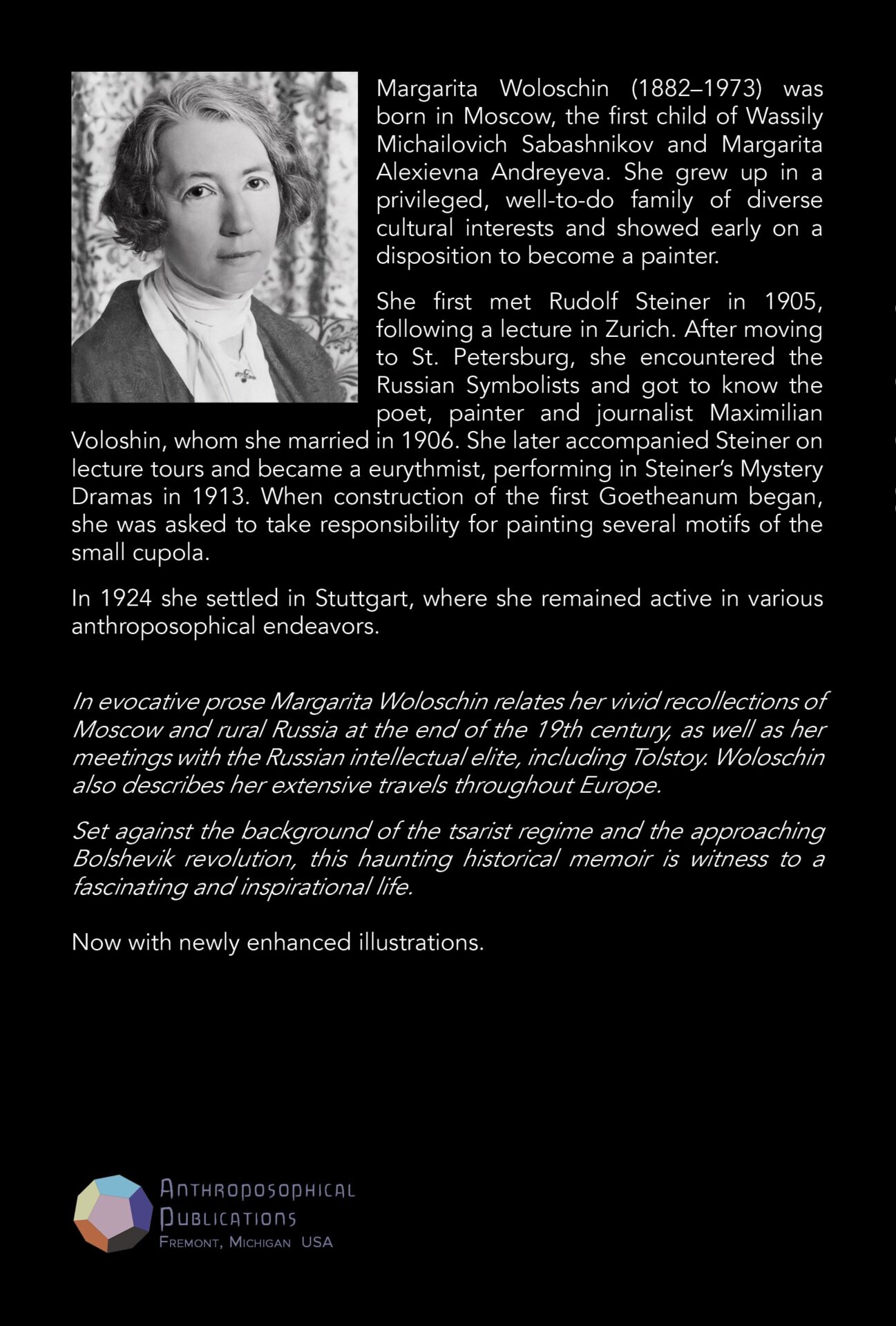 Instrumental in the introduction of anthroposophy into Russia, Woloschin recounts the construction of the original Goetheanum in Dornach, Switzerland, and its ultimate destruction. She shares her personal memories of Rudolf Steiner and the struggle for meaning in her own turbulent life. Returning to Russia during the First World War, she details the harsh deprivations of the Russian Revolution and its effects on her family and friends.