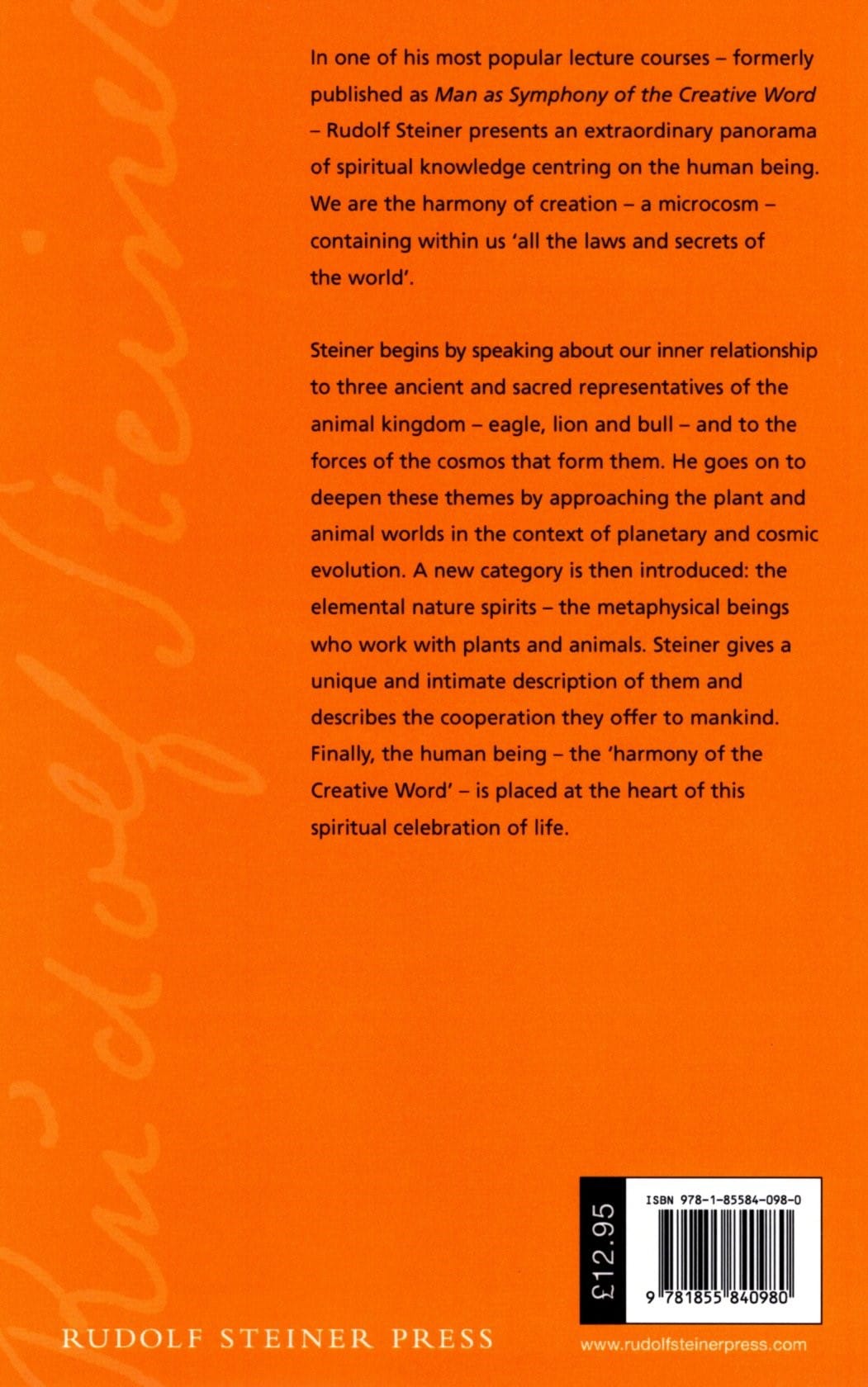 Finally, the human being—the “harmony of the Creative Word”—is placed at the heart of this spiritual celebration of life. These are important lectures for understanding Steiner’s view of humankind within the context of cosmic and earthly evolution.