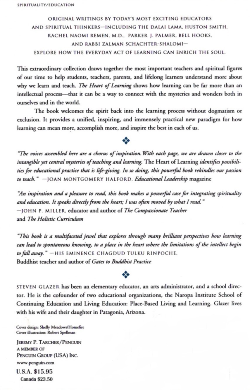 The Heart of Learning asks teachers and students to recommit themselves to what they love most in education. The renown contributors outline a map for enabling us to connect with the very reasons why we teach and learn thus to achieve greater fulfillment in both. Incisive essays by Parker Palmer, Rachel Naomi Remen, and the Tibetan lama Dozgchen Ponlop Rinpoche examine how our unique, individual experiences of the sacred can profoundly enrich how we learn and teach. Writings by bell hooks and the Dalai Lama show how we simultaneously can cultivate both individual beliefs and openness to the diversity of the contemporary classroom. Works by Huston Smith and Rabbi Zalman Schachter-Shalomi explore our need to balance our past histories and traditions with the needs of present and future generations. This extraordinary collection of original work provides a unified, inspiring, and immensely practical new paradigm for how teaching and learning can mean more, accomplish more, and inspire the best in each of us. This book is a must for every teacher, student, parent, and anyone who loves to learn.