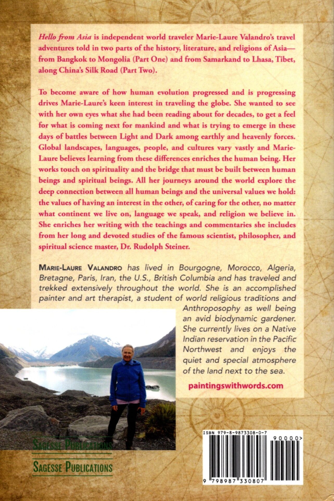 To become aware of how human evolution progressed and is progressing drives Marie-Laure’s keen interest in traveling the globe. She wanted to see with her own eyes what she had been reading about for decades, to get a feel for what is coming next for mankind and what is trying to emerge in these days of battles between Light and Dark among earthly and heavenly forces. Global landscapes, languages, people, and cultures vary vastly and Marie-Laure believes learning from these differences enriches the human being. Her works touch on spirituality and the bridge that must be built between human beings and spiritual beings. All her journeys around the world explore the deep connection between all human beings and the universal values we hold: the values of having an interest in the other, of caring for the other, no matter what continent we live on, language we speak, and religion we believe in. Enriching all of her writings are found the teachings and commentaries she includes from her long and devoted studies of the famous scientist, philosopher, and spiritual science master, Dr. Rudolf Steiner.