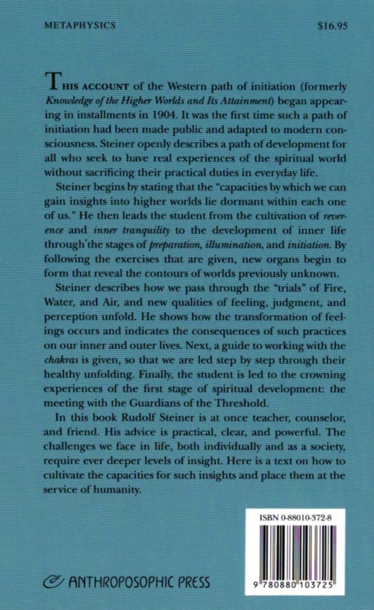 This is the classic account of the modern Western esoteric path of initiation made public by Steiner in 1904. He begins with the premise that “the capacities by which we can gain insights into the higher worlds lie dormant within each one of us.” Steiner carefully and precisely leads the reader from the cultivation of the fundamental soul attitudes of reverence and inner tranquility to the development of inner life through the stages of preparation, illumination, and initiation.
