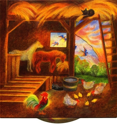 One of seven moving pictures, with a turning wheel inside, depicting different scenes during the course of the day.