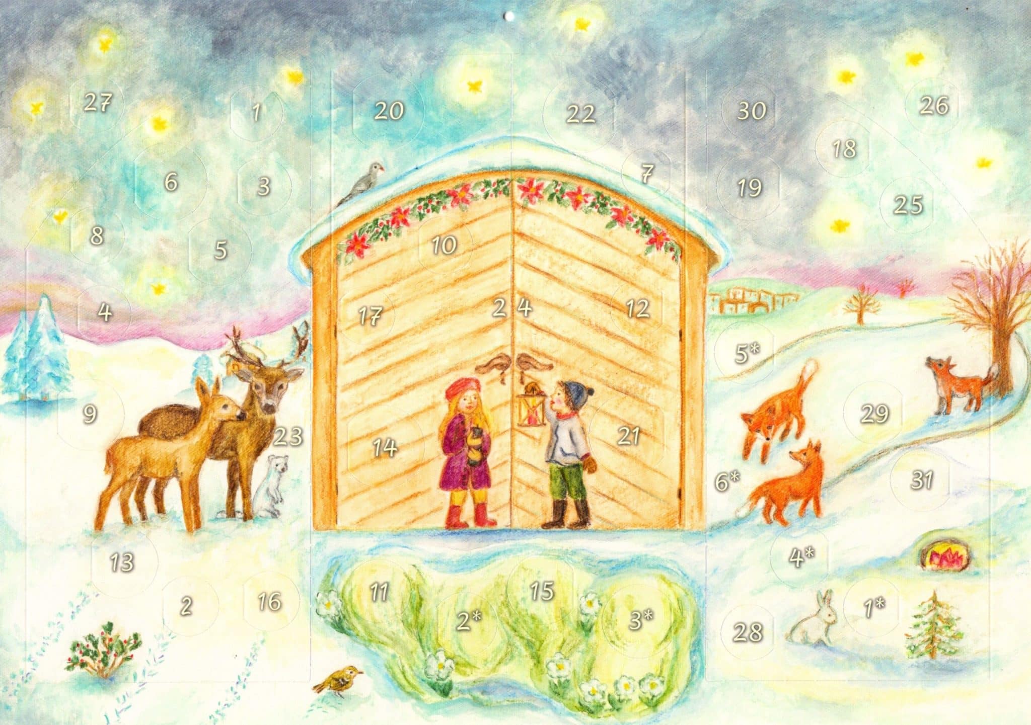 An Advent and Christmas Calendar with 37 doors, including three large doors, guides the children from Advent to Christmas and on to Epiphany.