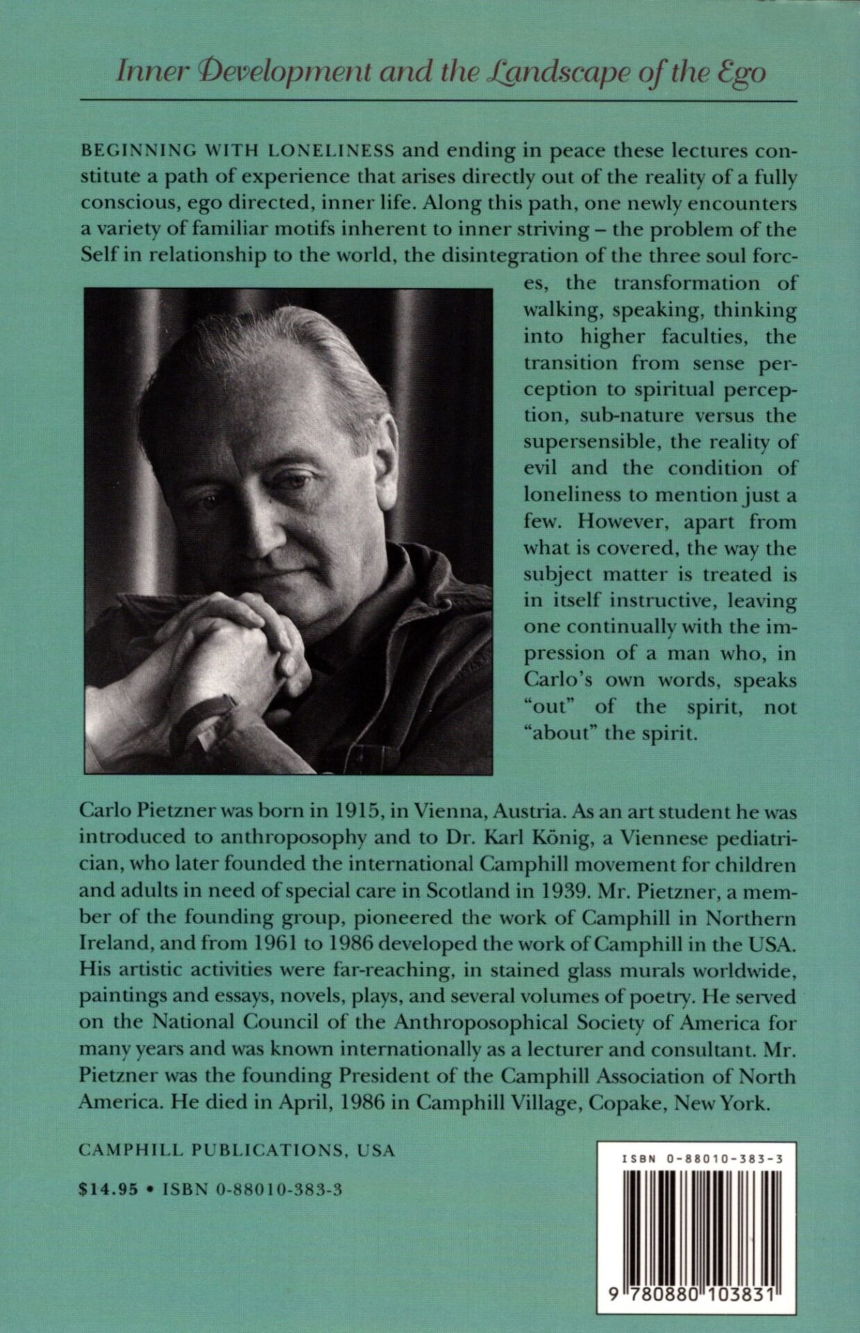 Carlo Pietzner (1915-1986) was born in Vienna. As an art student, he was introduced to anthroposophy and Dr. Karl König, founder of the international Camphill movement for children and adults in need of special care, which led Pietzner to help further the work of Camphill in Northern Ireland and the U.S. His artistic efforts have ranged from stained glass murals and paintings to novels, and drama. He served the Anthroposophical Society in America and was known internationally for his many lectures and his consulting work.