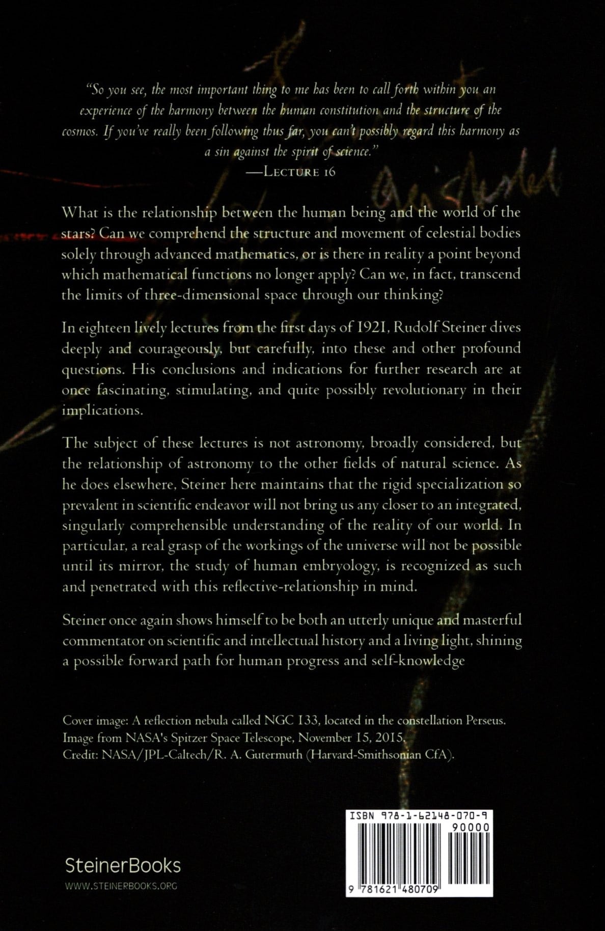 The subject of these lectures is not astronomy, broadly considered, but the relationship of astronomy to the other fields of natural science. As he does elsewhere, Steiner maintains that the rigid specialization so prevalent in scientific endeavors will not bring us any closer to an integrated, singularly comprehensible understanding of the reality of our world. In particular, a true grasp of the workings of the universe will not be possible until its mirror, the study of human embryology, is recognized as such and penetrated with this reflective relationship in mind.