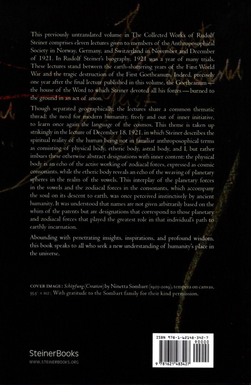 Though separated geographically, the lectures share a common thematic thread: the need for modern humanity, freely and out of inner initiative, to learn once again the language of the cosmos. This theme is taken up strikingly in the lecture of December 18, 1921, in which Steiner describes the spiritual reality of the human being not in familiar spiritual-scientific terms as consisting of physical body, etheric body, astral body, and “I,” but instead imbues these otherwise abstract designations with inner content—the physical body as an echo of the activity of zodiacal forces and expressed as cosmic consonants, while the etheric body reveals an echo of the weaving of planetary spheres in the realm of vowels.