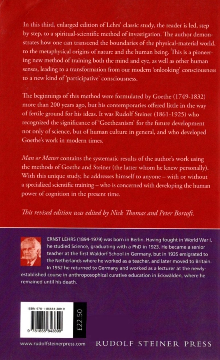 Man or Matter contains the systematic results of the author’s work with the methods of Goethe and Steiner (whom he knew personally). In this unique study, Lehrs addresses himself to anyone—with or without a specialized scientific training—concerned with developing the human power of cognition in the present time.