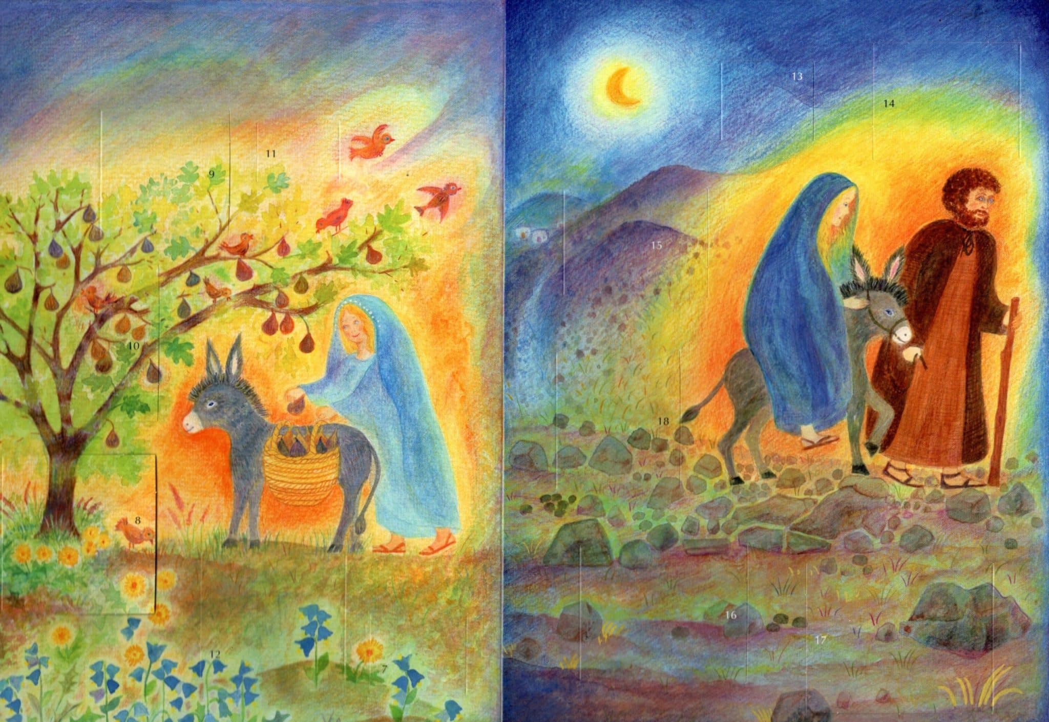 Shows the journey to Bethlehem, with children, birds, animals and shepherds, and a glimpse into Joseph’s carpentry workshop. Crib scene on the 24th of December and a bright new star is revealed on the 25th !