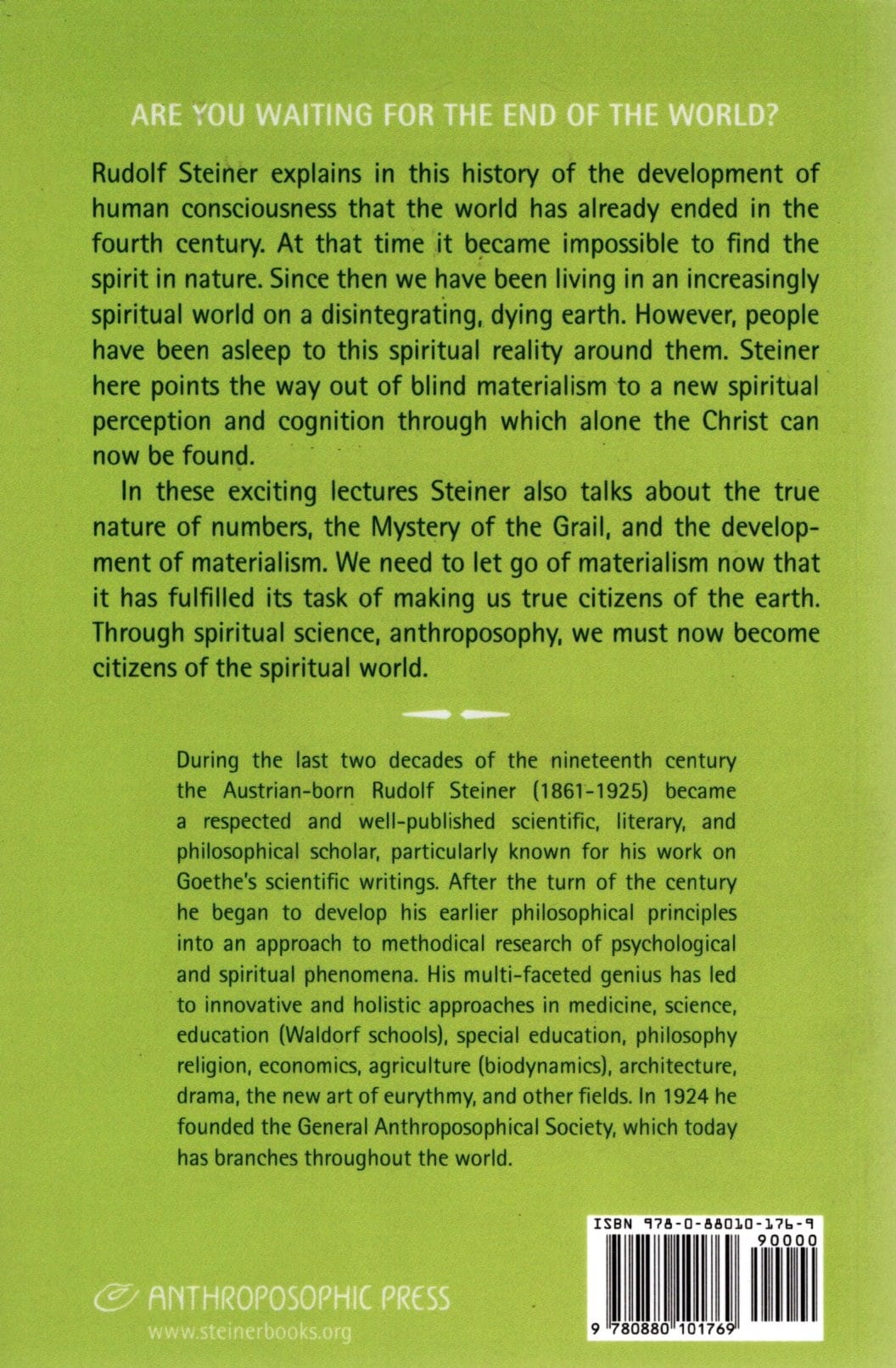 In this history of human consciousness, Steiner explains that the world ended in AD 300, when it became impossible to find spirit in nature. Since then, we have been living in an increasingly spiritual world on a disintegrating, dying Earth. Although people have been asleep to the spiritual reality that surrounds us, Steiner shows a way out of today’s blind materialism that takes us toward a new spiritual perception and knowledge, which is the only way that we will find the Christ in our time.