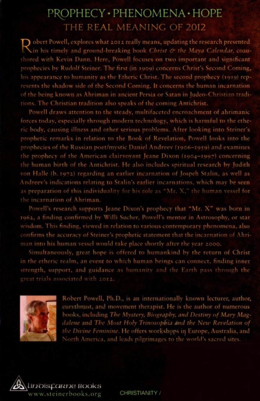 Prophecy Phenomena Hope: The Real Meaning of 2012 by Robert Powell, explores what 2012 really means, updating the research presented in his timely and ground-breaking book Christ and the Maya Calendar: 2012 and the Coming of the Antichrist (coauthored with Kevin Dann). In this new book, Powell focuses on two important and significant prophecies by Rudolf Steiner. The first (from 1909) concerns the Second Coming of Christ, his appearance to humanity as the Etheric Christ.
