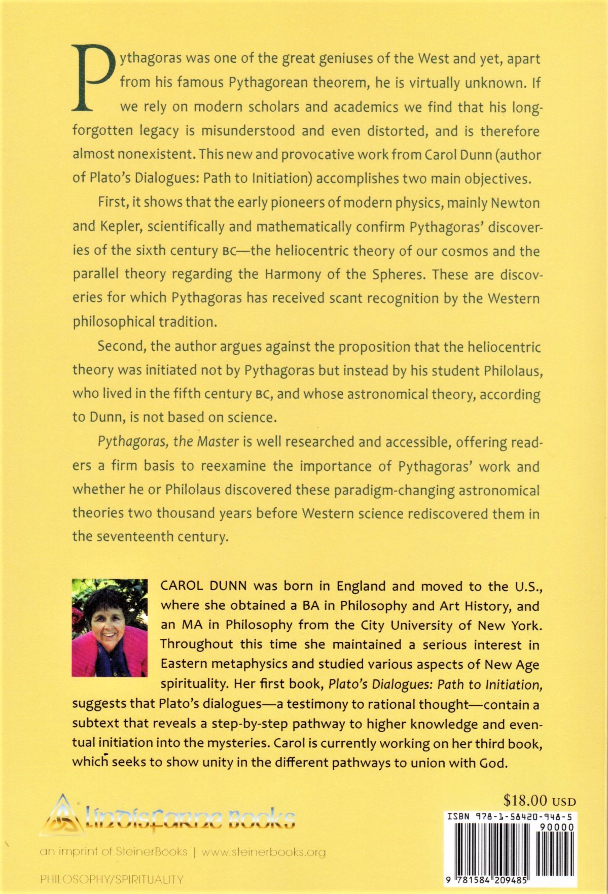Pythagoras was one of the great geniuses of the West and yet, apart from his famous Pythagorean theorem, he is virtually unknown. If we rely on modern scholars and academics we find that his long-forgotten legacy is misunderstood and even distorted, and is therefore almost nonexistent. This new and provocative work from Carol Dunn (author of Plato’s Dialogues: Path to Initiation) accomplishes two main objectives.