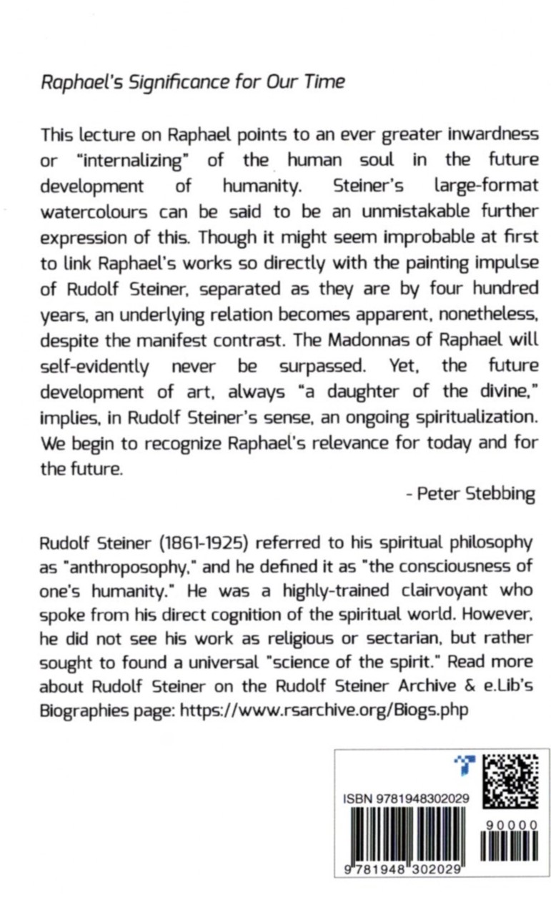 This lecture on Raphael points to an ever-greater inwardness or “internalizing” of the human soul in the future development of humanity. Steiner’s large-format watercolours can be said to be an unmistakable further expression of this. Though it might seem improbable at first to link Raphael’s works so directly with the painting impulse of Rudolf Steiner, separated as they are by four hundred years. An underlying relation becomes apparent, nonetheless, despite the manifest contrast. The Madonnas of Raphael will self-evidently never be surpassed. Yet, the future development of art, always “a daughter of the divine,” implies, in Rudolf Steiner’s sense, an ongoing spiritualization. We begin to recognize Raphael’s relevance for today and for the future.