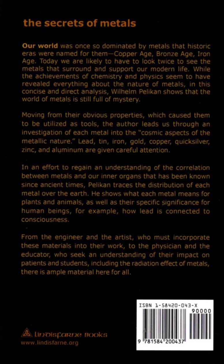 In The Secrets of Metals, Wilhelm Pelikan—in the light of spiritual science—discusses the significance of the classic “seven metals” and their importance for humankind as well as for nature as a whole and the Earth. He also discusses the “newer” metals as well as the virtually unknown “radiation effects of metals—the effects of which Rudolf Steiner used therapeutically. Pelikan’s method here is a phenomenological one, in which he helps us try to see natural objects in the Goethean sense, as developed by Rudolf Steiner.