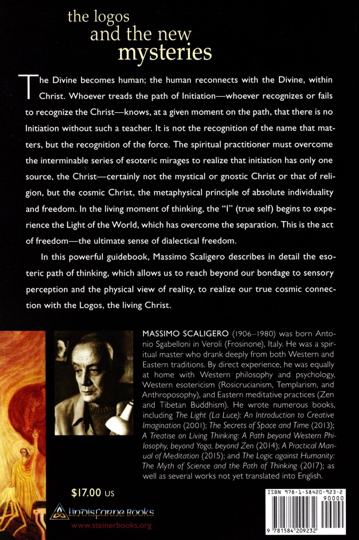 Massimo Scaligero (1906–1980) was born Antonio Scabelloni in Veroli (Frosinone), Italy. He was a contemporary Italian spiritual master who drank deeply from both Western and Eastern traditions. By direct experience, he was equally at home with Western philosophy and psychology, Western esotericism (Rosicrucianism, Templarism, and Anthroposophy) and Eastern meditative practices (Zen and Tibetan Buddhism). He was the author of numerous books, including (in Italian, untranslated): The Way of the Solar Will; Immortal Love; Yoga, Meditation, Magic; From Yoga to the Rose Cross; Practical Manual of Meditation; The Logos and the New Mysteries; Psychotherapy; Techniques of Inner Concentration; Healing with Thinking; Meditation and Miracles; Thinking as Antimaterialism; Western Kundalini; Isis Sophia; and Zen and Logos.