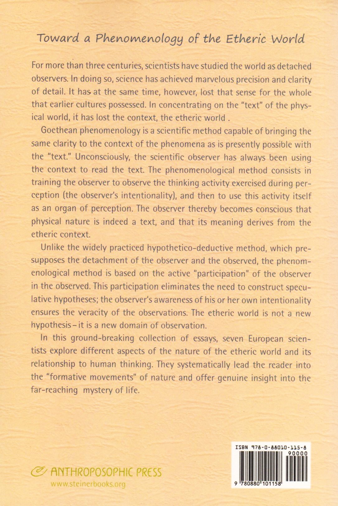 Toward a Phenomenology of the Etheric World is a translation from German of Erscheinungsformen des Ätherischen. Wege zum Erfahren des Lebendigen in Natur und Mensch (Freies Geistesleben, 1985).