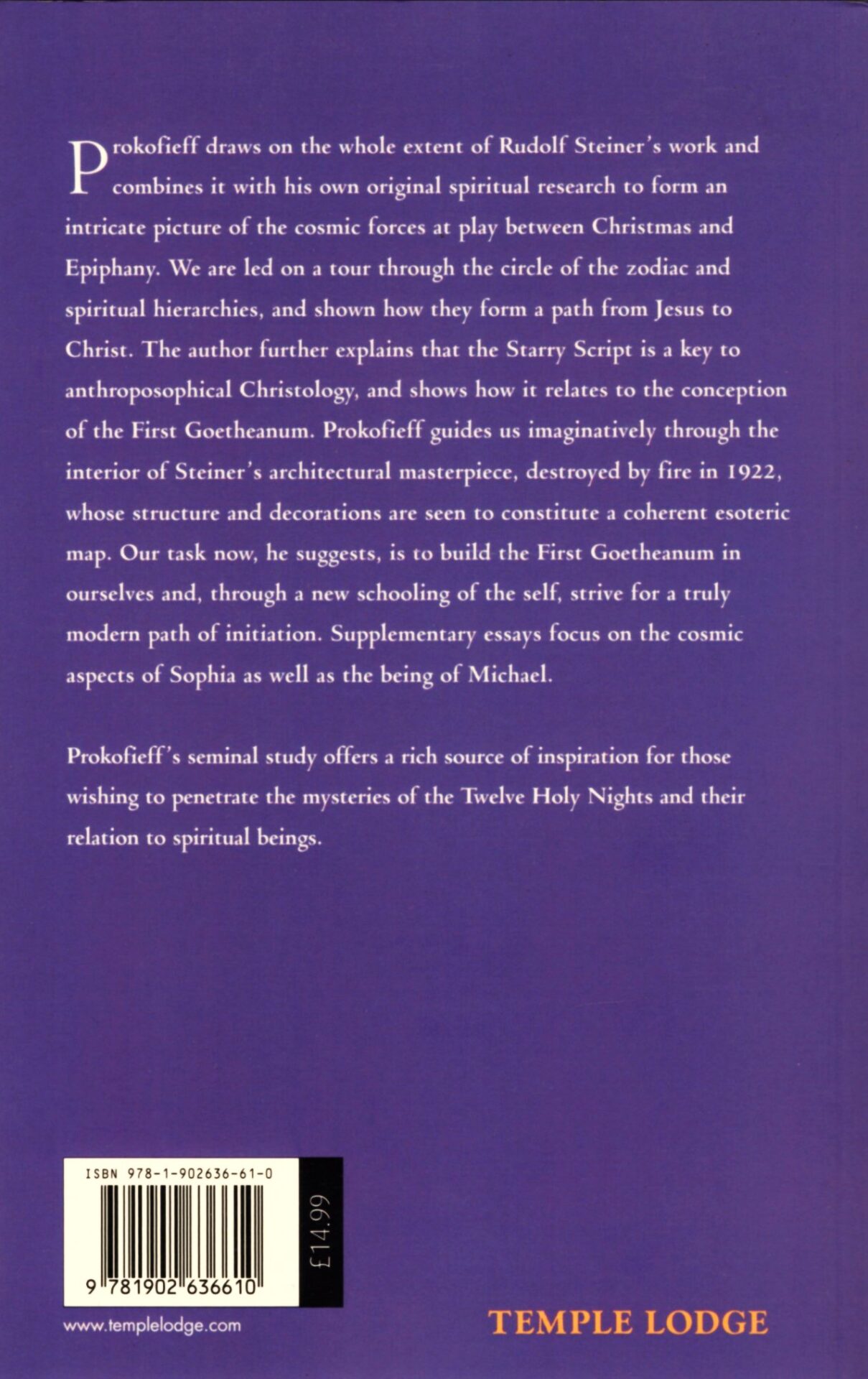 The author further explains that the Starry Script is a key to anthroposophical Christology, and shows how it relates to the conception of the original Goetheanum. Prokofieff guides us imaginatively through the interior of Steiner’s architectural masterpiece (which was destroyed by fire at the end of 1922). Its structure and decor are seen to constitute a coherent esoteric map. Our task now, he suggests, is to rebuild the first Goetheanum within ourselves and, through a new form of self-development, work toward a truly modern path of initiation.