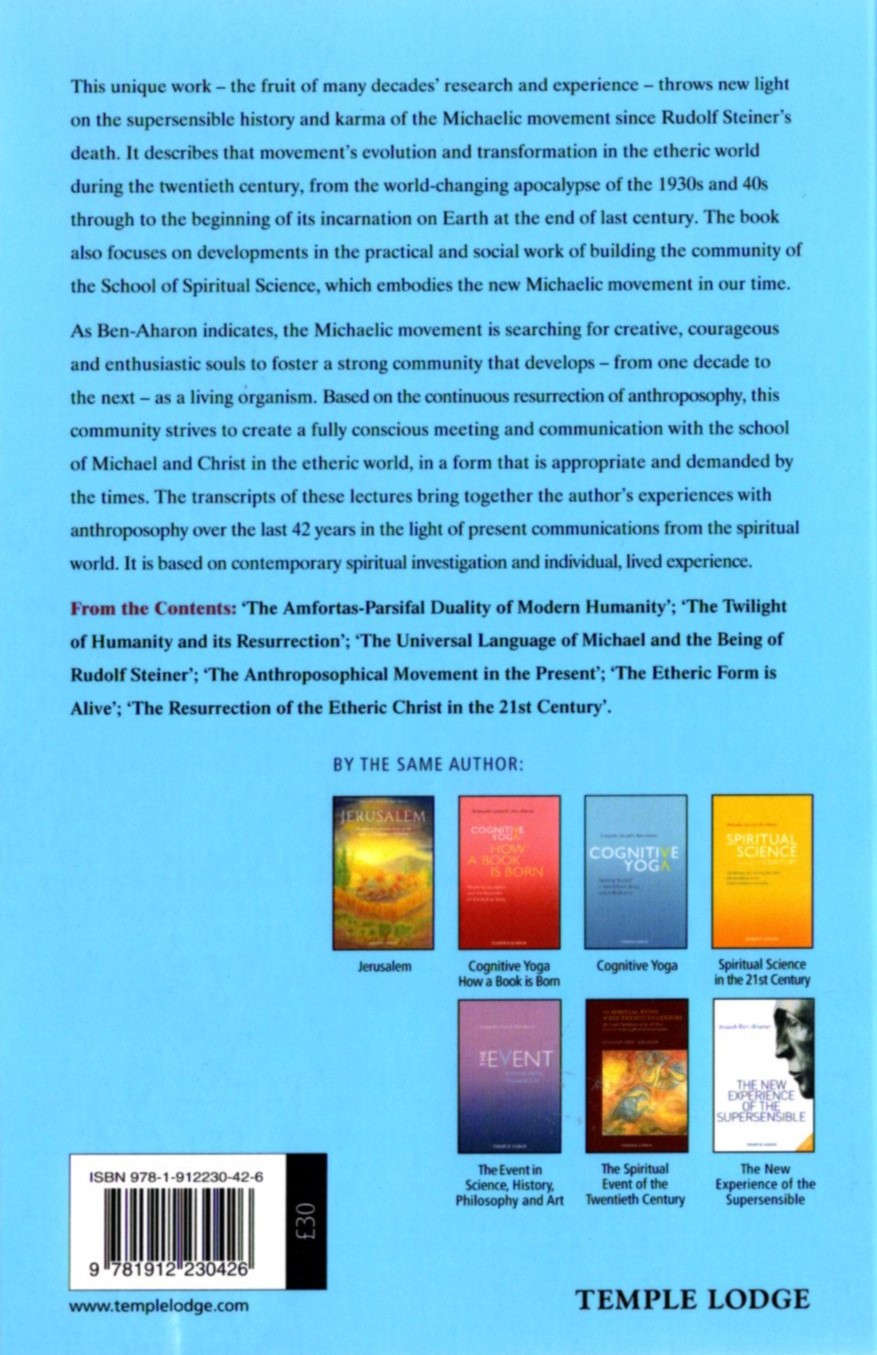 As Ben-Aharon indicates, the Michaelic movement is searching for creative, courageous, and enthusiastic souls to foster a strong community that develops—from decade to decade—as a living organism. Based on the continuous resurrection of Anthroposophy, this community strives to create a fully conscious meeting and communication with the school of Michael and Christ in the etheric world, in a form that is appropriate and required by the time. The transcripts of these lectures collect the author’s experiences with Anthroposophy during the past four decades in the light of present communications from the spiritual world. It is based on contemporary spiritual investigation and individual, lived experience.
