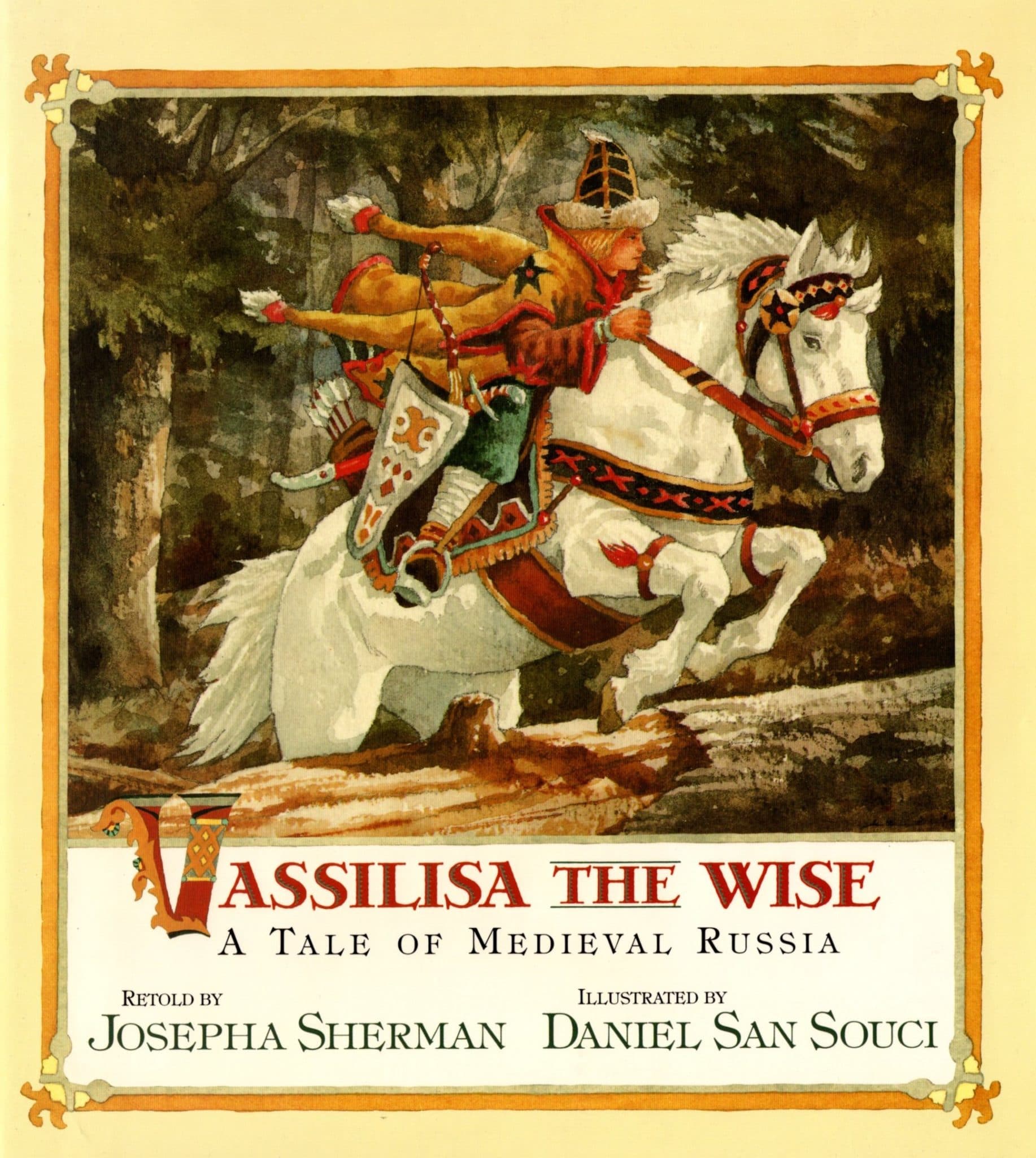 The story tells how, one-day Prince Vladimir was having a party, but one of his princes was not looking happy, when asked why, he responds that he misses his wife, Vassilisa, who is the wisest person. The king gets mad at him and throws him from the court and puts him into prison. When Vasilisa finds of his fate, she dresses as a tartar warrior and starts towards the court, sending Prince Vladimir a request of 20 years of tribute for the horde. The prince is scared, but when he receives Vassilisa as a tartar ambassador, he is surprised when “Vasilli” asks for the prince’s niece hand in marriage. The niece suspects that Vasilli is a woman, so they set tasks for her to prove it: first some wrestling, then archery, and last chess; where the prince gambles his city, for the winner. Vasilisa wins, but asks only for the niece. Then, she requests music for the party, when the music is not to her liking, the prince has to call Staver, Vasilsa’s husband, to come and play at the party. Vasilisa tricks the prince into giving her Staver the musician, in exchange for sparing the city from the Tartar hordes. After the Prince agrees, Vasilisa shows herself as a woman. The prince agrees that Vasilisa is, indeed, wise, as Satver had proclaimed. Everything was forgiven and Staver and Vasilisa drink, eat and are joyful.