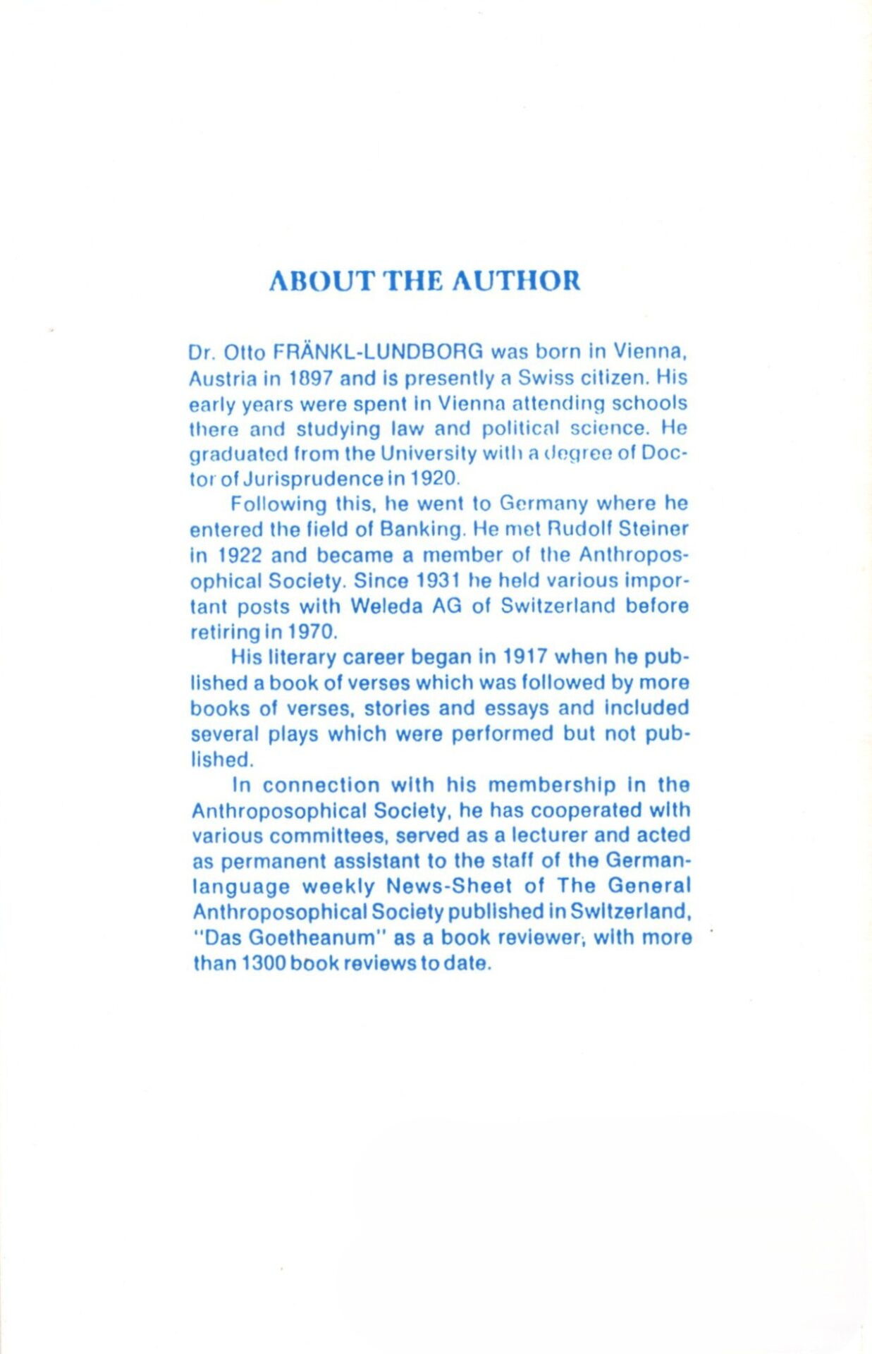 Dr. Otto Frankl-Lundborg, earned a doctorate in jurisprudence in Vienna in 1920 and then at the age of 25 met Rudolf Steiner. He held various positions with the Weleda company and served on committees of the Anthroposophical Society. His literary career included publishing books of verse, stories, essays and over 1300 book reviews.