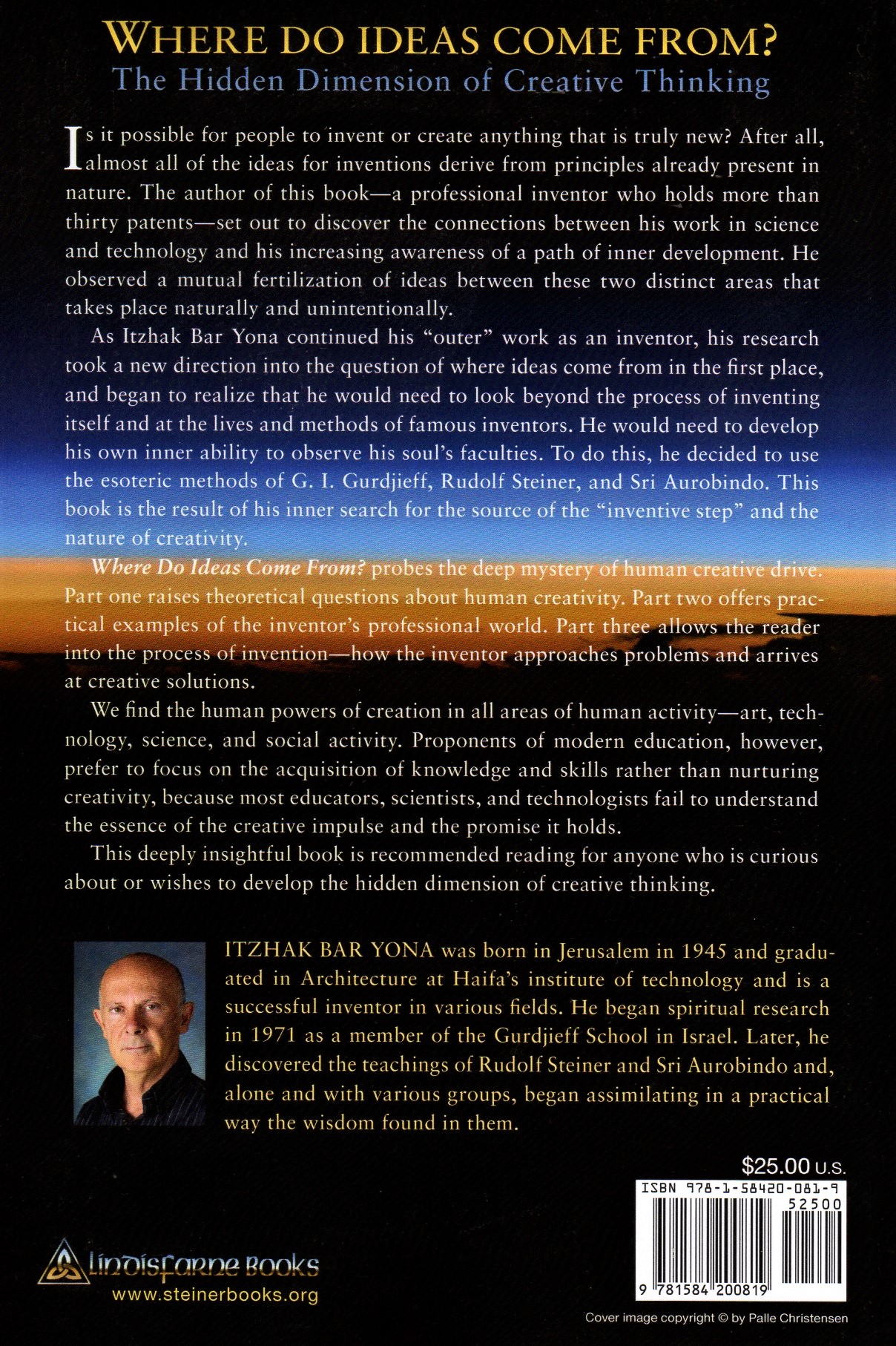 As Itzhak Bar Yona continued his “outer” work as an inventor, these questions and observations began a new direction of research into the question about the true source of creativity and invention. In the process, he realized that he would not obtain answers by looking only at the process of inventing itself or at the lives and methods of famous inventors, but would need to develop his own inner ability to observe his soul’s faculties. To do this, he decided to use the esoteric methods of G.I. Gurdjieff, Rudolf Steiner, and Sri Aurobindo. This book, Where Do Ideas Come From, is the result of the author’s continuing inner search for the source of the “inventive step” and the true nature of creativity.