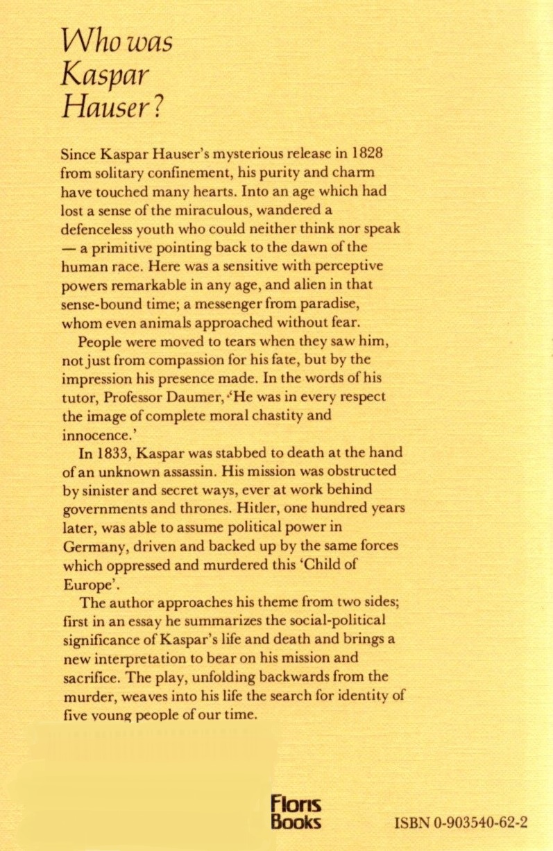 The author approaches this theme from two sides; first in an essay that summarizes the social-political significates of Kaspar’s life and death and brings a new interpretation to bear on his mission and sacrifice. The play, unfolding backwards from the murder, weaves into his life the search for identity of five young people of our time.