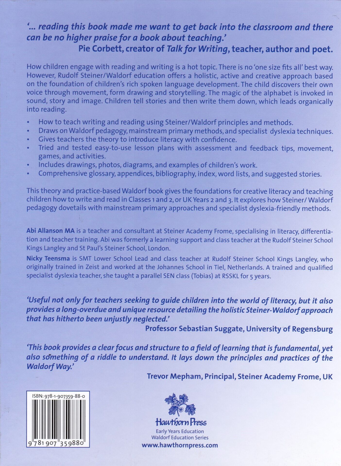 The book showcases the holistic, creative aspects of the Steiner Waldorf literacy approach. The teaching of writing before reading is prioritized so as to engage children’s creativity in learning. Developing the child’s own voice through writing and storytelling, to lead over into reading, is highly effective for motivation and success.