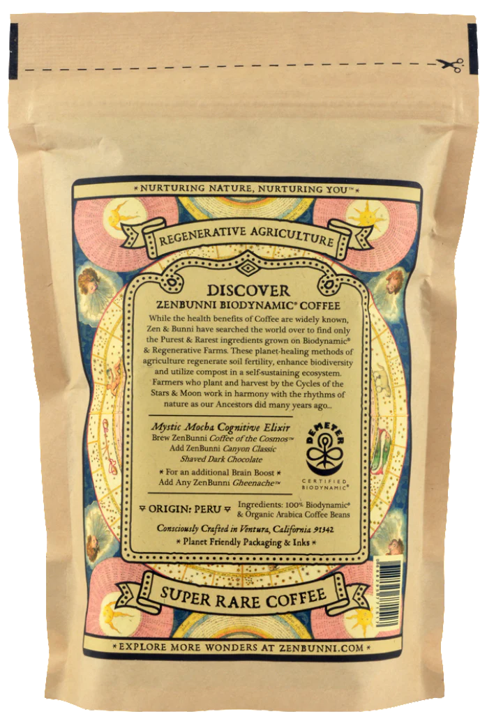 Coffee of the Cosmos is ZenBunni's flagship medium roast — whole bean, certified biodynamic, and roasted to preserve the bean's origin character rather than bury it under smoke. Every harvest comes from farms that treat soil as a living organism, build fertility season after season, and operate without synthetic pesticides or fertilizers.